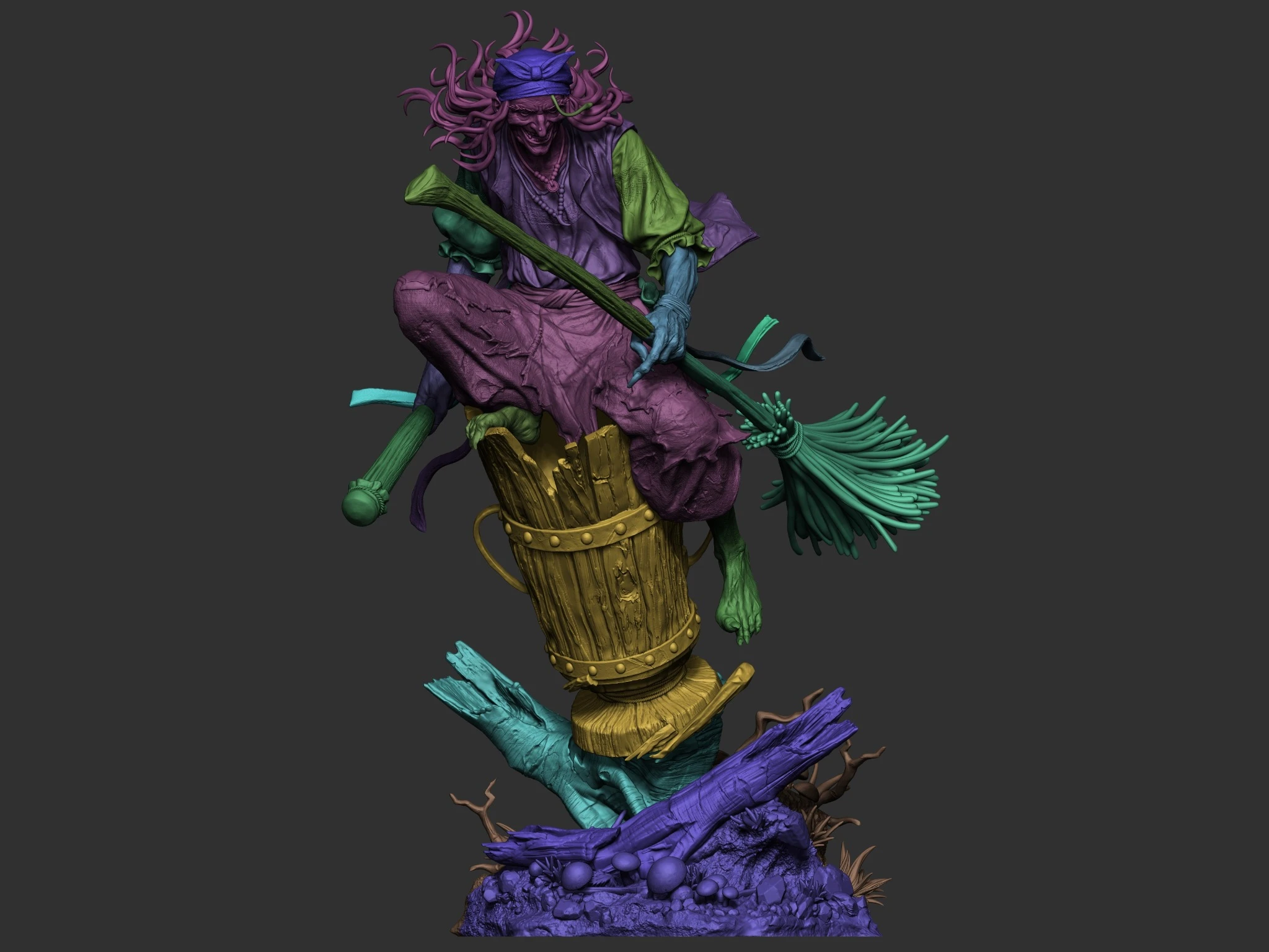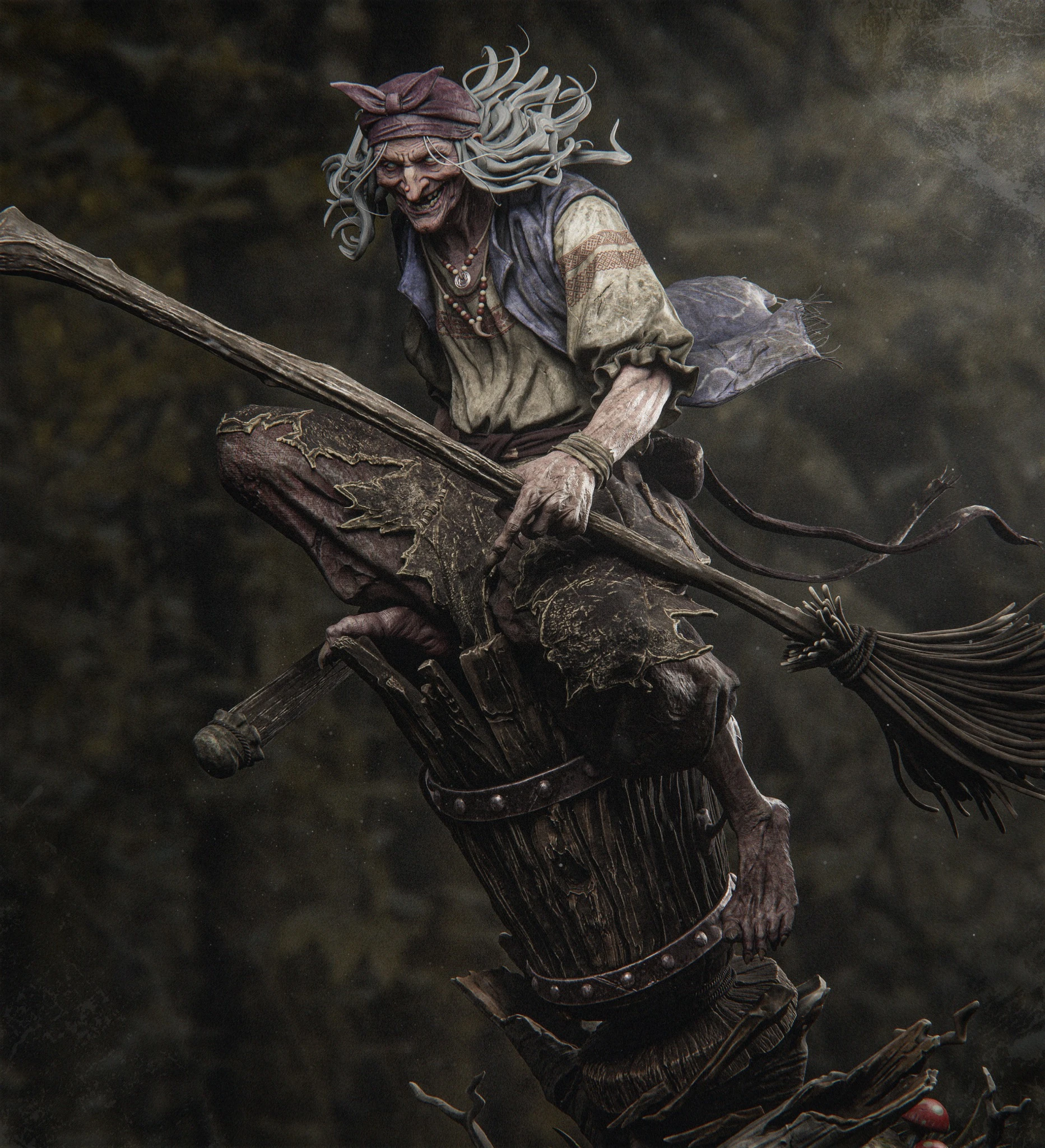 Baba Yaga to klasyczna wiedźma ze słowiańskich legend – dzika, wyniosła, groźna. Siedzi w zaczarowanym moździerzu i prowadzi miotłę jak ster. Całość jest pełna drobnych detali: zmarszczki twarzy, rozdarte tkaniny, korzenie i muchomory przy podstawie. Model został zaprojektowany z myślą o malowaniu i ekspozycji jako centerpiece w gablocie.
