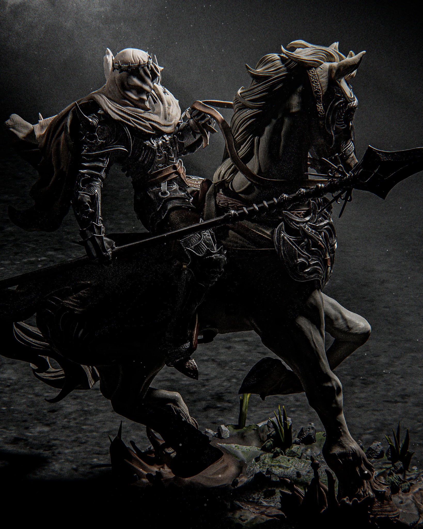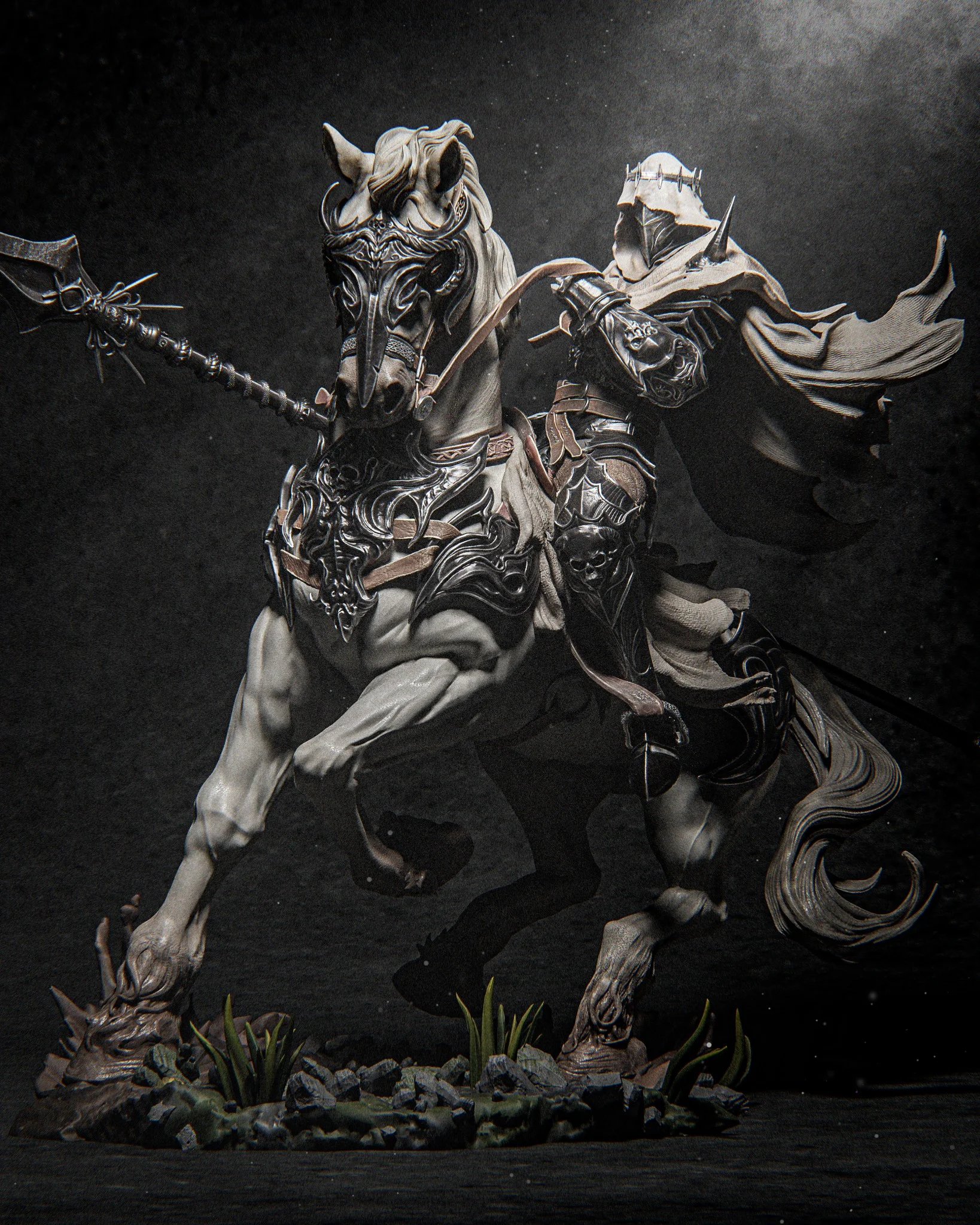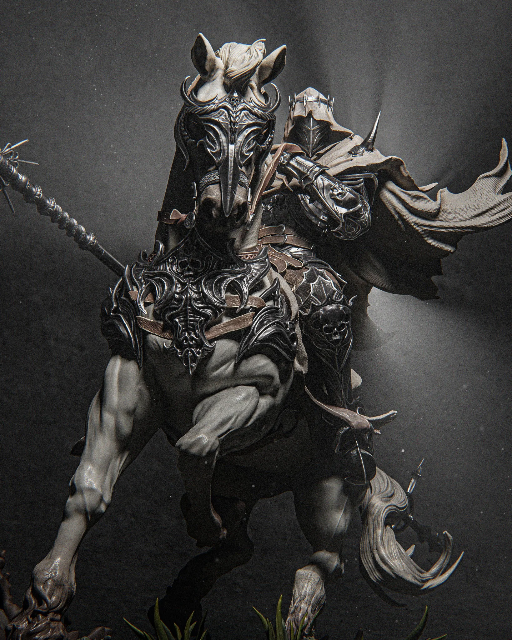 Monumentalna żywiczna figura Dareiosa, mrocznego wojownika w pełnej zbroi, dosiadającego bojowego rumaka.