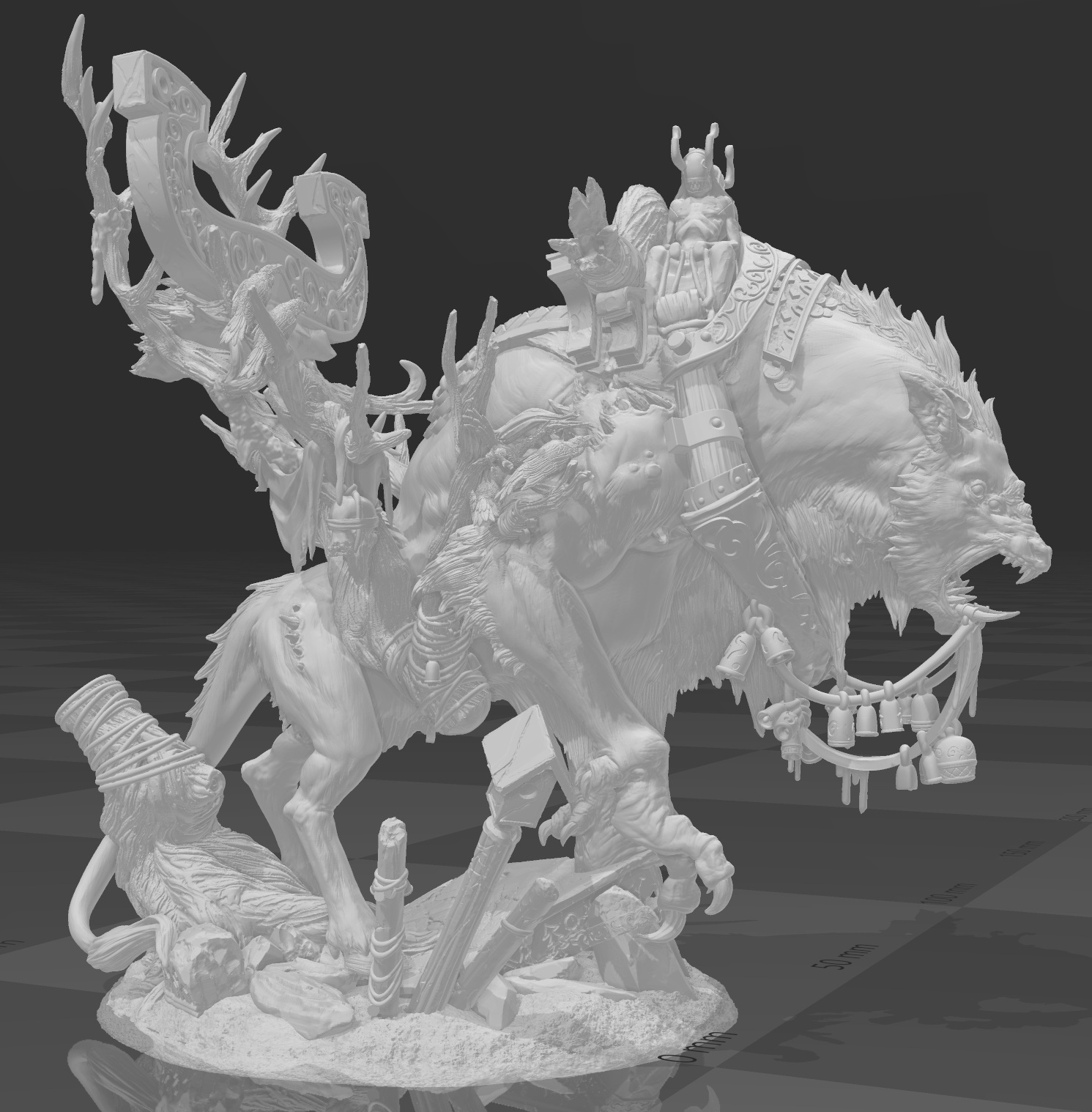 Monstrualny leśny bóstwór z serii Gloamwood Whispers. Poskręcane poroże, rytualne ozdoby i muskularna sylwetka tworzą imponujący centerpiece do dioram i armii fantasy. Gęsta faktura futra i ornamenty na pancerzu dają świetną bazę pod cieniowanie i drybrush.