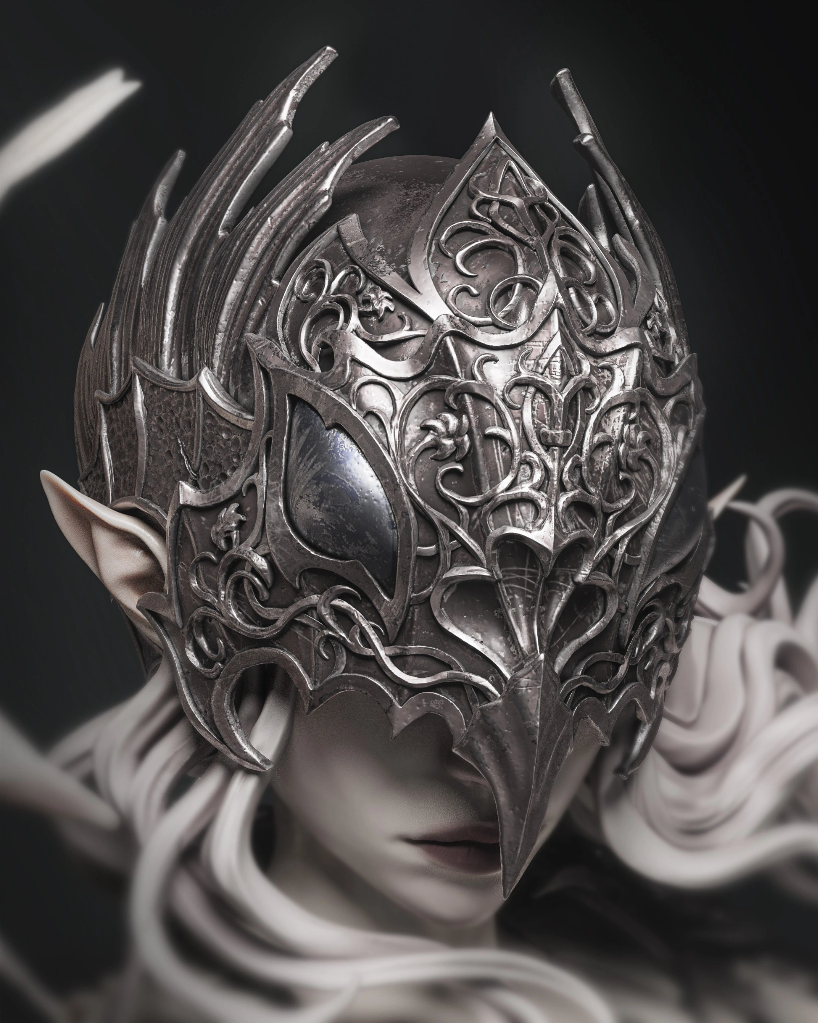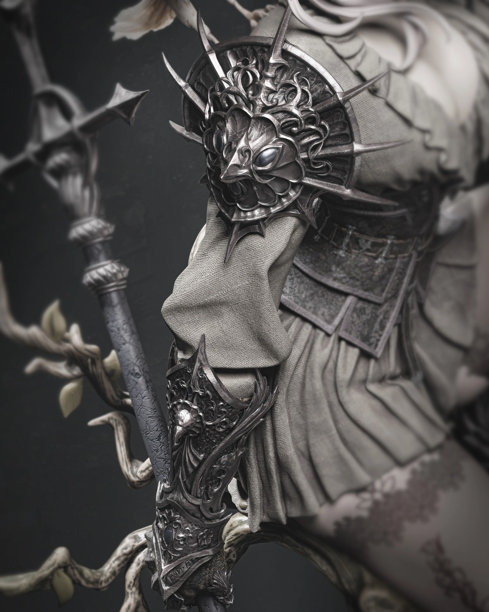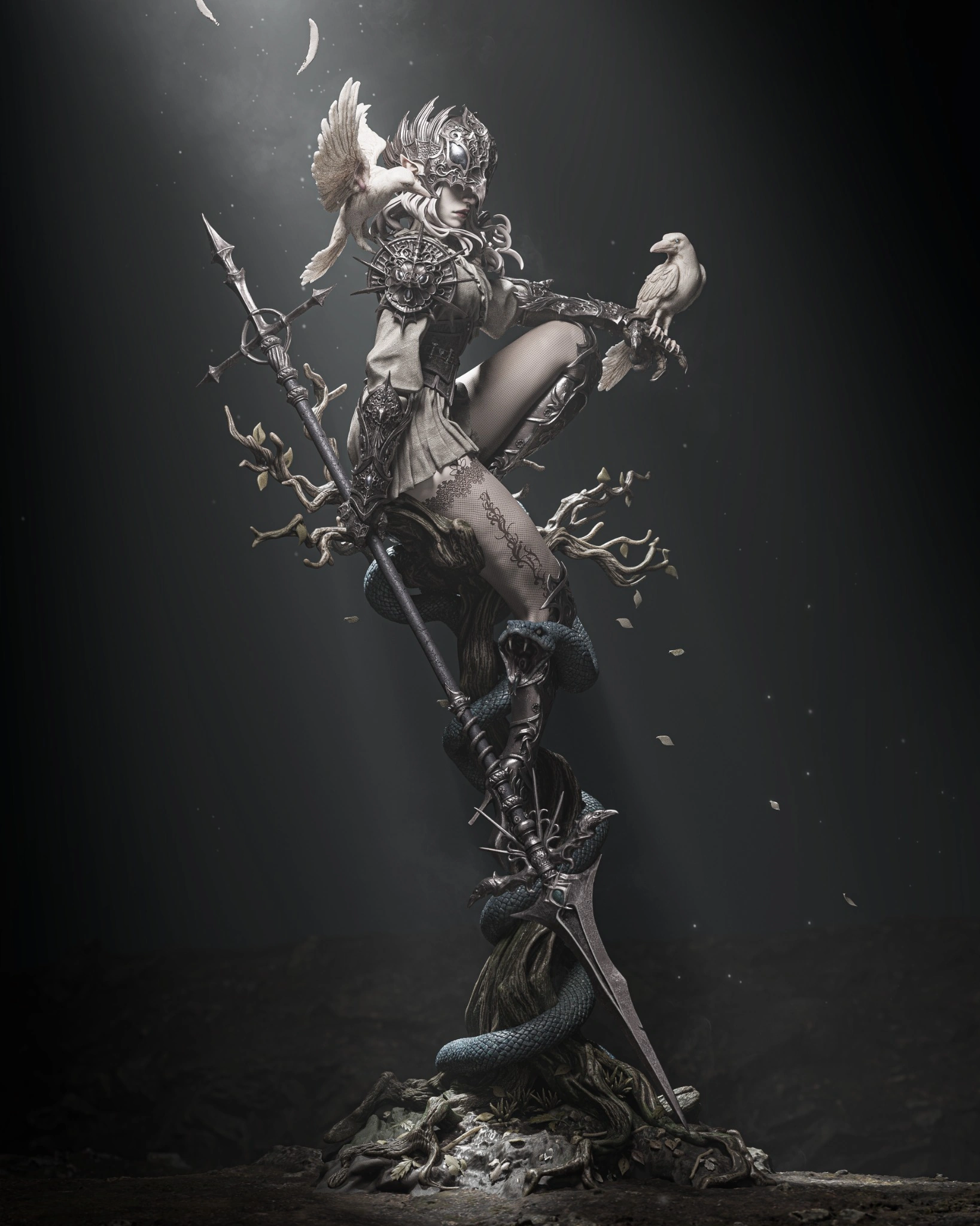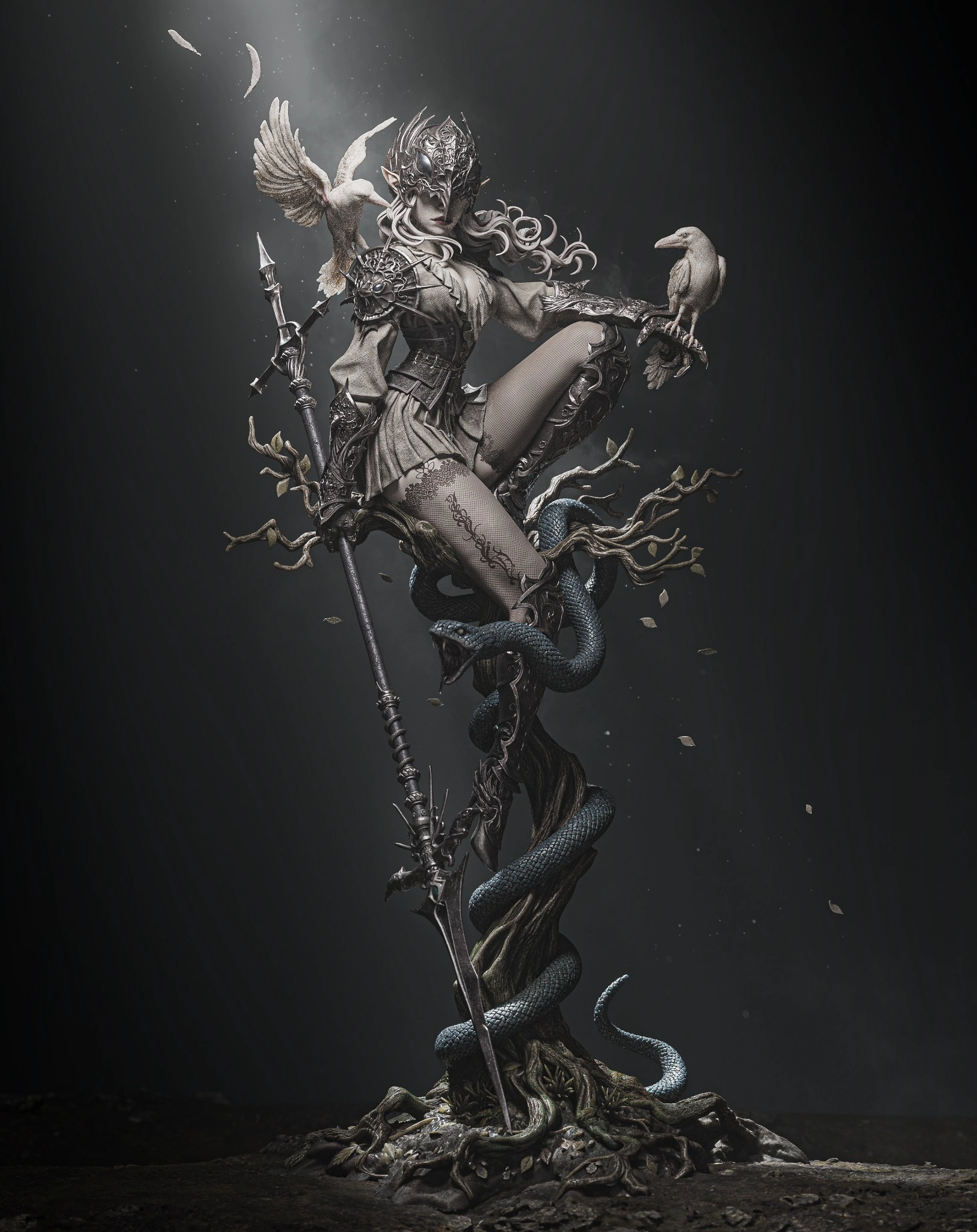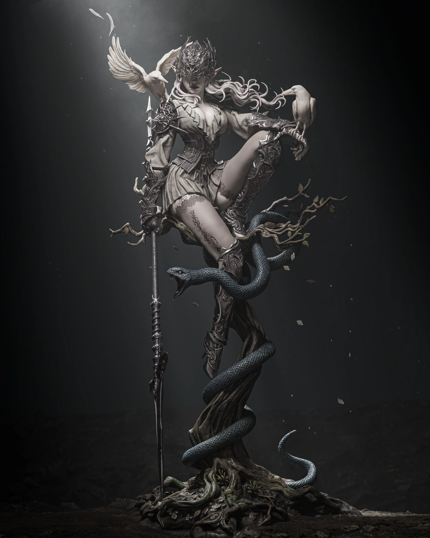 Lenora – Queen of Crows to majestatyczna postać balansująca pomiędzy światłem i cieniem. Krucza królowa, odziana w misternie rzeźbioną zbroję, wsparta na splątanych korzeniach, z wijącym się u jej stóp wężem i ptakami czuwającymi nad każdym ruchem. Dynamiczna poza, bogactwo ornamentów oraz kontrast delikatności z drapieżnością czynią z tej figury prawdziwy centerpiece każdej kolekcji.