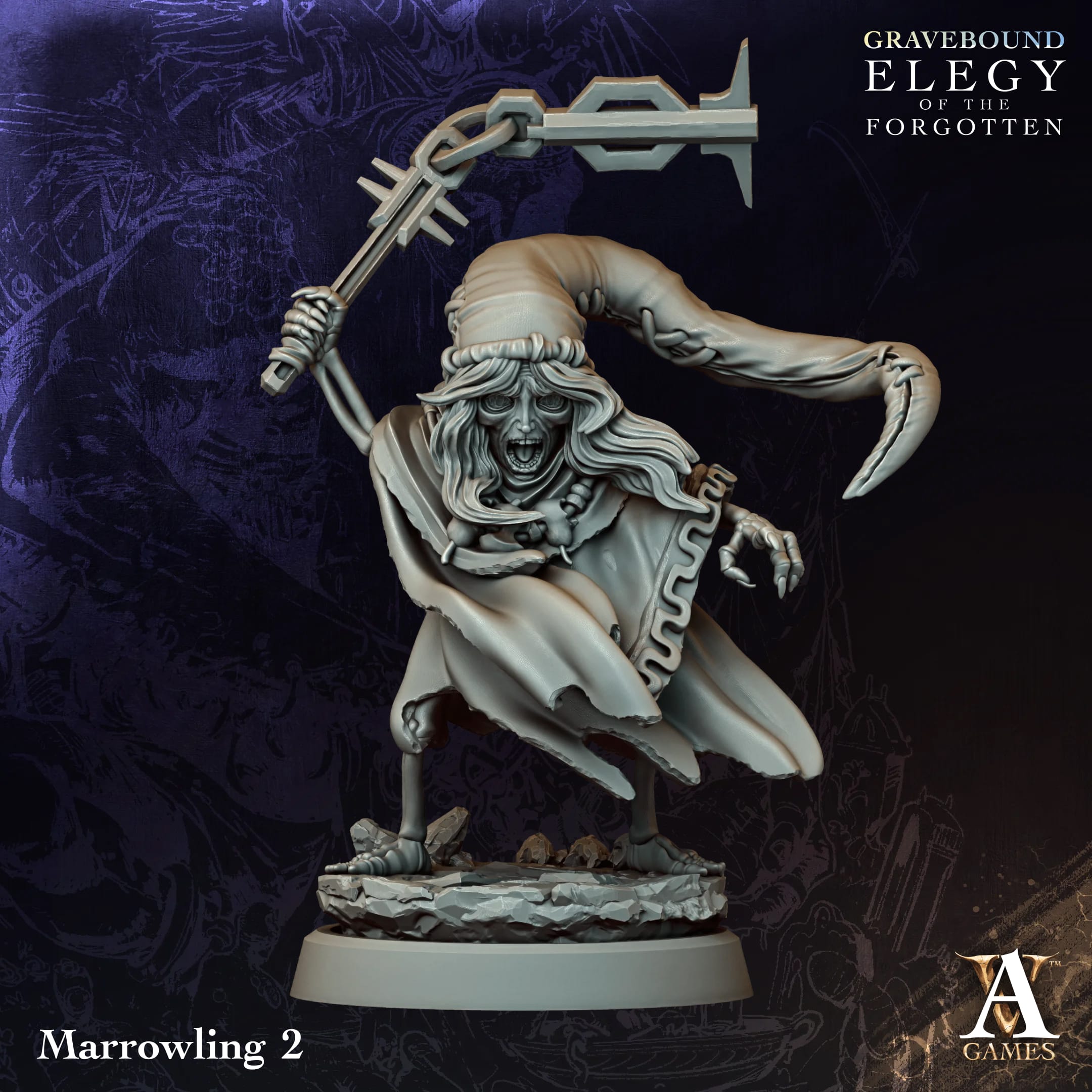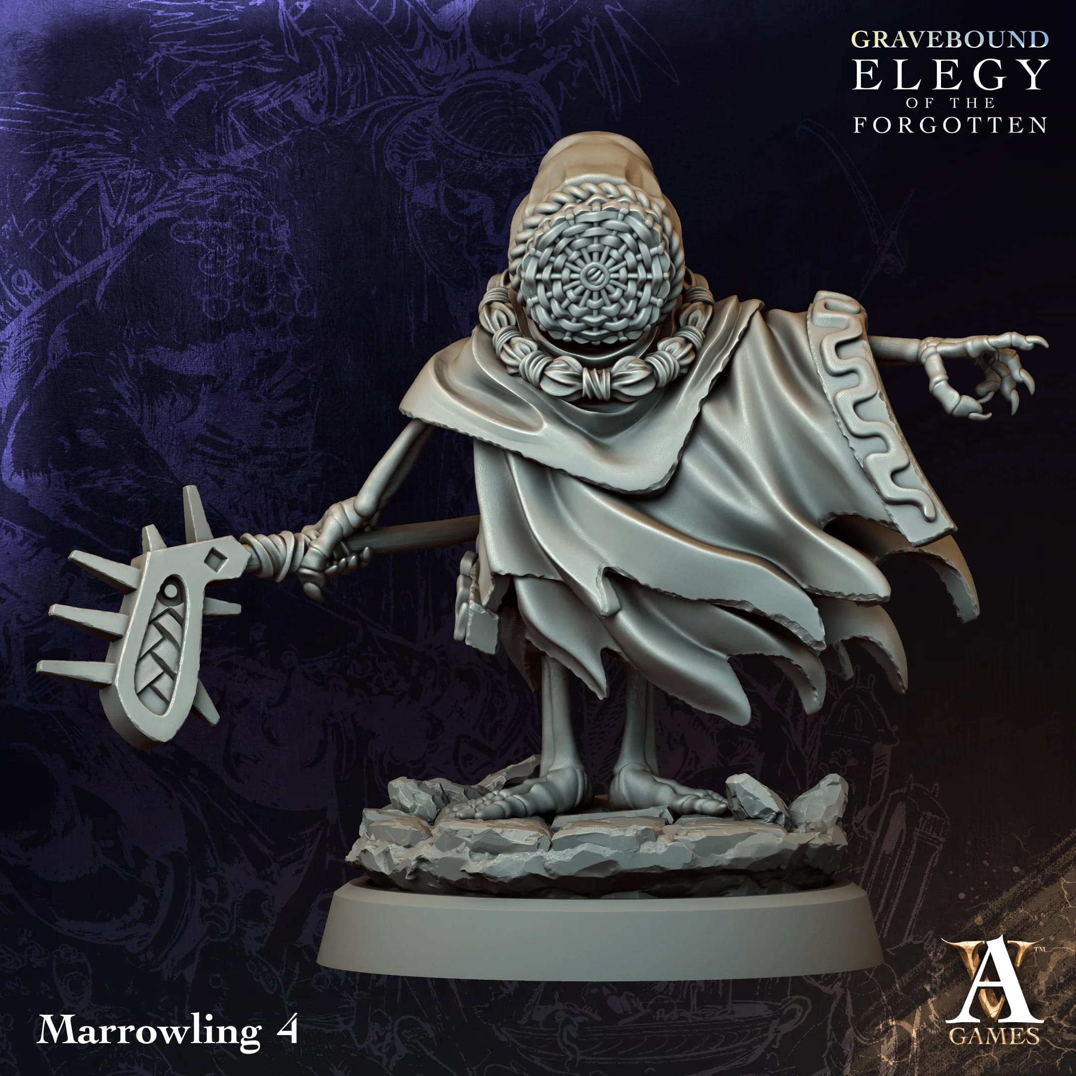 Zestaw czterech Marrowlingów to kolekcja mrocznych, eterycznych istot o unikalnych sylwetkach i charakterystycznych, rytualnych atrybutach. Każda figurka prezentuje inny typ ruchu, uzbrojenia i ornamentyki, tworząc spójny, a jednocześnie zróżnicowany wizualnie komplet.