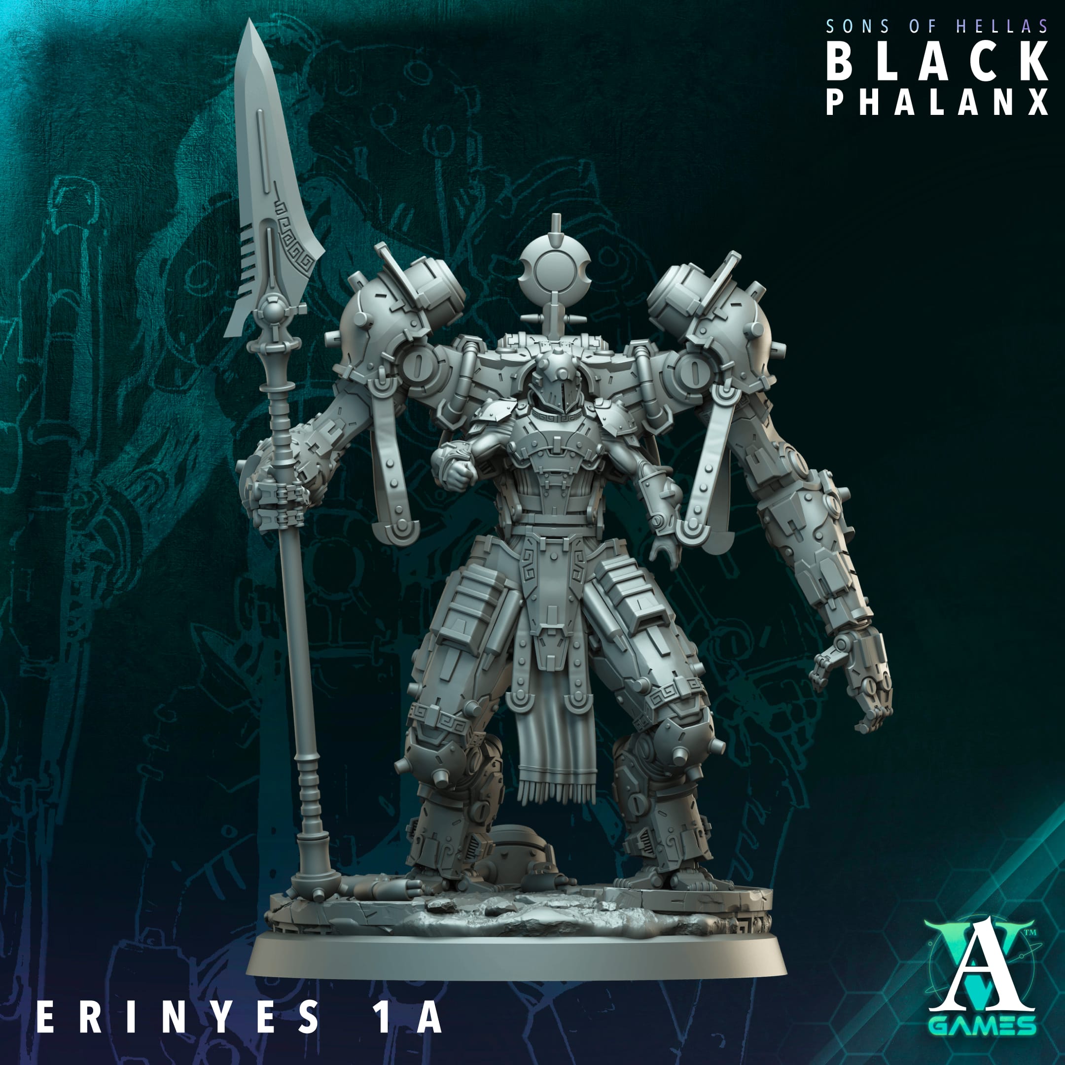 Potężne mechy bojowe klasy Erinyes to ciężkozbrojne jednostki szturmowe frakcji Black Phalanx. Każda figurka przedstawia inną konfigurację opancerzenia i uzbrojenia – od włóczni bojowych po futurystyczne karabiny dalekiego zasięgu. Charakterystyczne są masywne pancerze segmentowe, hydrauliczne ramiona wspomagające oraz greckie motywy ornamentowe. Idealne jako centrum armii sci-fi lub modele kolekcjonerskie.